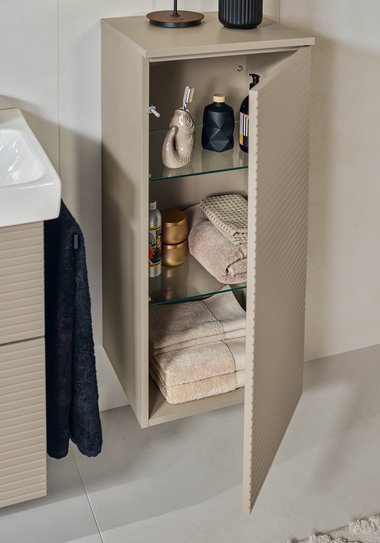 Horizontal strukturierte Fronten in zahlreichen Farben – ein Highlight optisch und haptisch. Die Möbelfronten bestechen mit ihrer strukturierten Oberfläche, der Möbelkorpus ist dabei immer gleichfarbig und glatt. Ganz ohne Griffe – Push to open für schlichte Optik und perfekte Funktion. Alle Türen, Schubladen und Auszüge von 3way-Struktur öffnen durch leichtes Antippen der Front. Geöffnete Elemente schließen automatisch per Selbsteinzug nach sanftem Anstoßen Unterschiedliche Keramik-Waschbecken mit passenden Unterbauten im Set oder zahlreiche Unterbauten zu Waschbecken verschiedener Hersteller sowie die perfekte Harmonie mit der Kollektion 3way lassen keine Wünsche offen. Ausgewählte Beimöbel sorgen für den benötigten Stauraum.